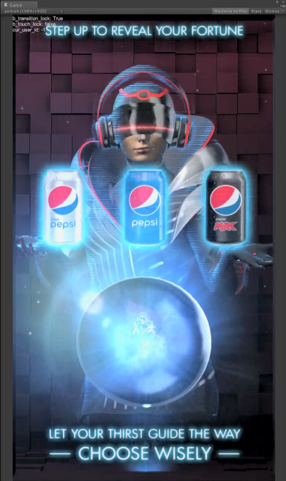 This Pepsi project ran on a vending machine outfitted with a Kinect and minimal power computer at South by Southwest. My responsibilities included the environment, the UI, the FX, and creating the shader for the character to fade in and out via a scanline effect. I managed the Unity art side of the project and took responsibility for performance profiling as it became an issue.